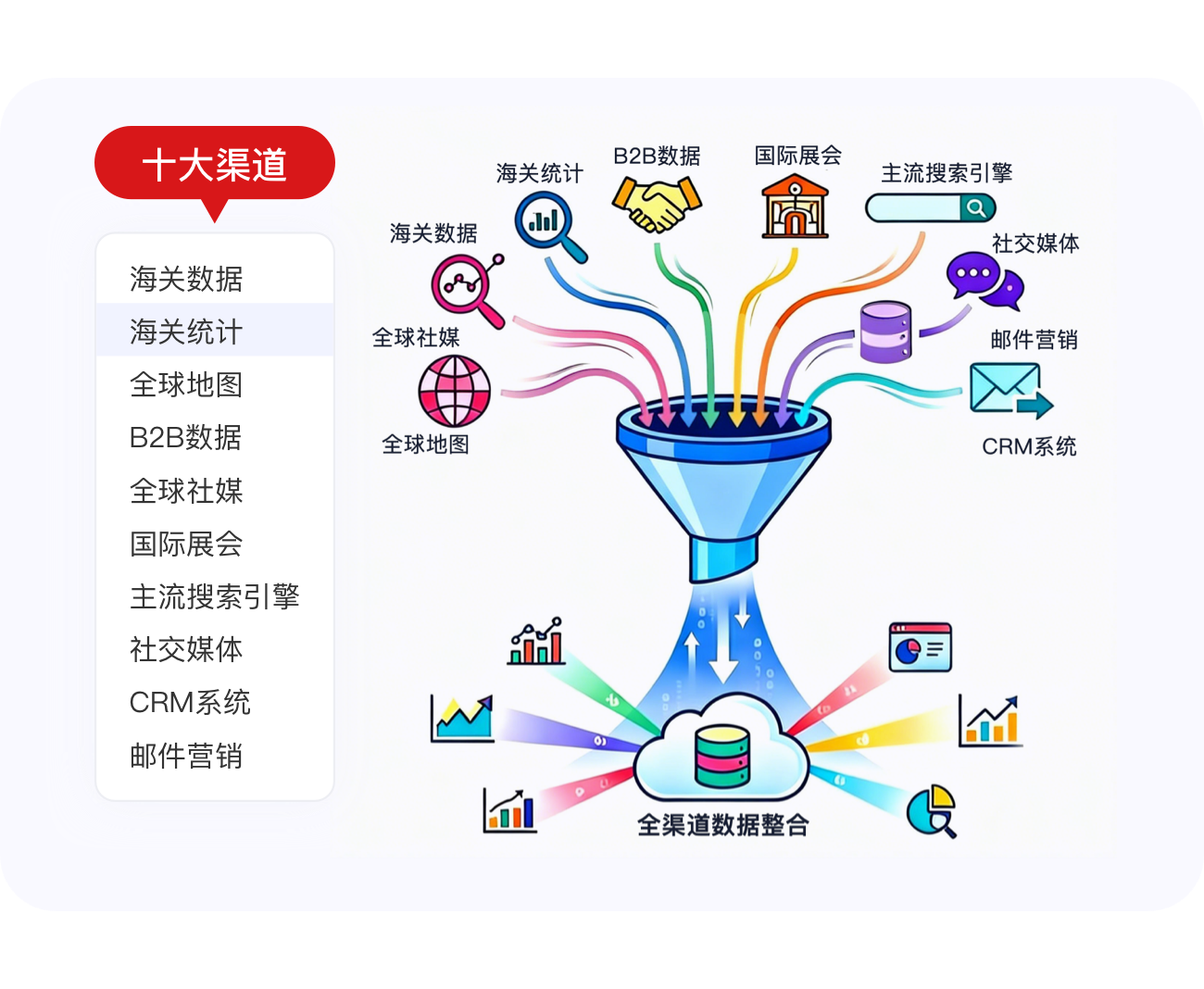 无缝整合海关交易、企业社媒、地理地图数据,绘制360°客户全景画像。