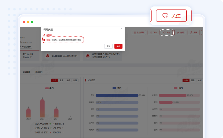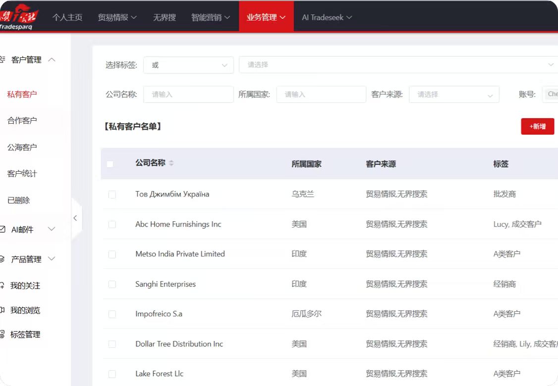 基于云端的客户资料和业务流程标签式管理;订阅并追踪重要客户/伙伴的贸易行为,寻找客户、搜索邮箱、发送邮件、外贸客户开发的全流程管理,包括对邮件、客户。业务渠道、客户类型的全方位科学管理。
